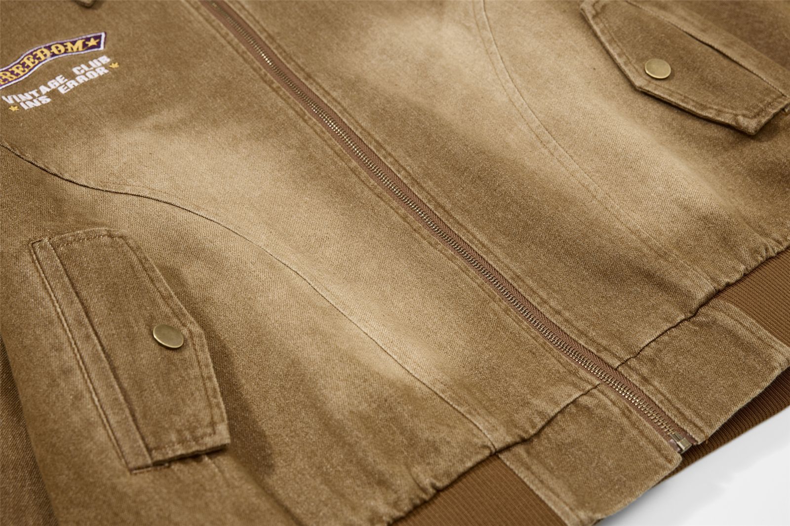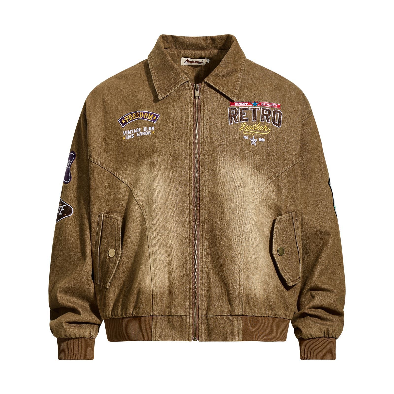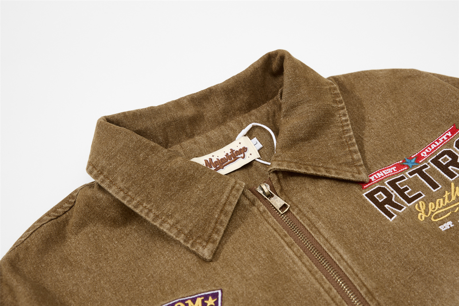 Retro Heavyweight Letter Embroidery Streetwear Cargo Jacket for Men, Loose Couple's Turn-Down Collar Outerwear
